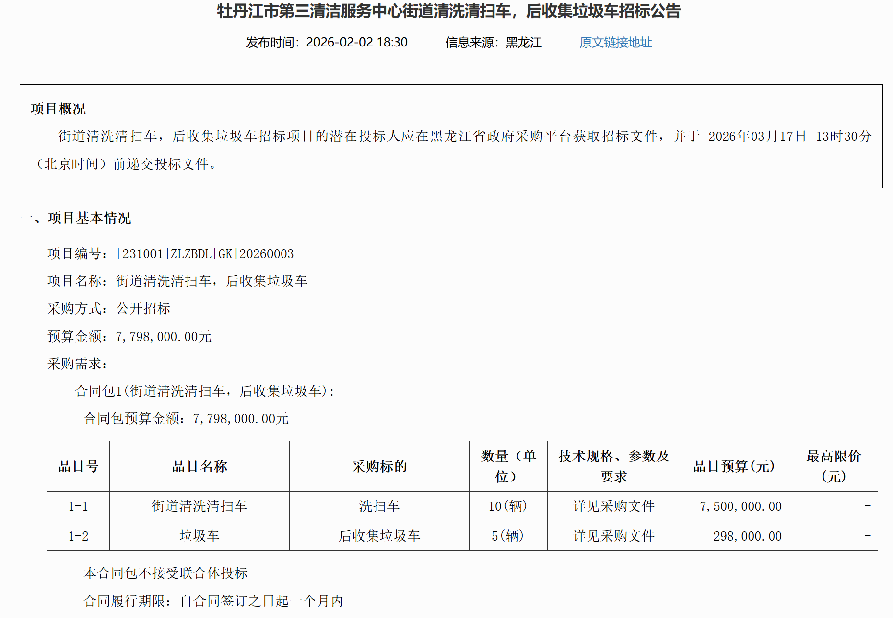 2月14日,徐州市云龙区城市管理局新能源环卫特种作业车辆采购项目-新能源压缩式垃圾车公开招标公告发布。本项目采购4.5方新能源压...