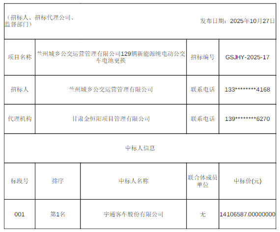 10月27日,兰州城乡公交运营管理有限公司129辆新能源纯电动公交车电池更换中标结果公告发布。公告显示,中标人名称为宇通客车,中标价格为1410.6587万元。