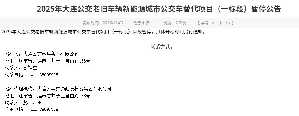 2025年大连公交老旧车辆新能源城市公交车替代项目(一标段)暂停公告