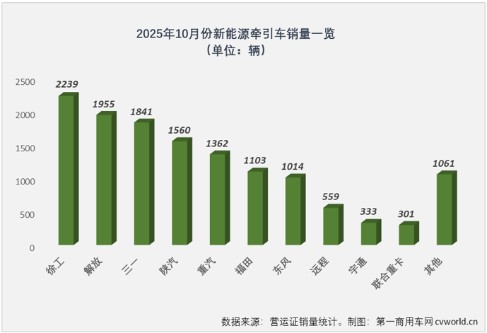 营运证观察:10月新能源牵引车销1.3万辆大增1.5倍!徐工摘冠累销逼近解放,三一/陕汽排第几?