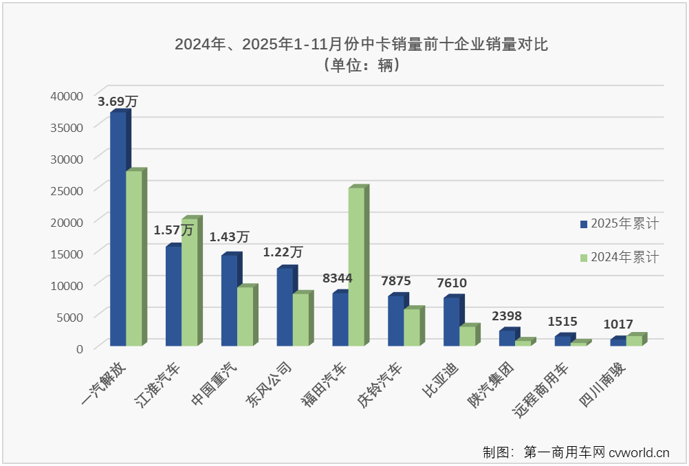 解放摘冠,重汽/江淮/东风拼前二,比亚迪暴涨585%,11月中卡销近万辆增15%