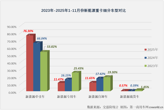 【第一商用车网 原创】2025年11月份,我国新能源重卡整体销量再创新高,同比继续交出翻倍增长的成绩单。作为当前新能源重卡领域的“小众”赛道,氢燃料电池重卡与混合动力重卡在11月份双双跑输新能源重卡市场“大盘”。