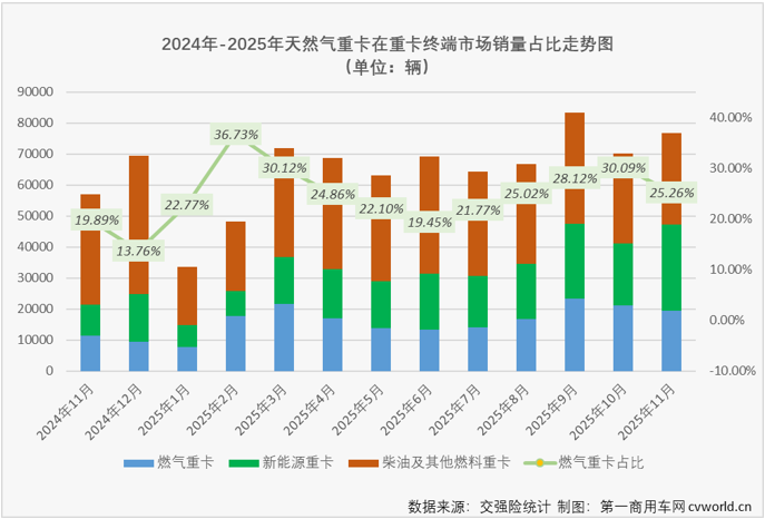 【第一商用车网 原创】2025年11月份,国内天然气重卡实销1.94万辆,环比今年10月份下降8%,同比则继续实现增长,增幅为71%,虽较上月(+138%)缩窄不少,但也保持了大增之态,收获一波同比“4连增”。