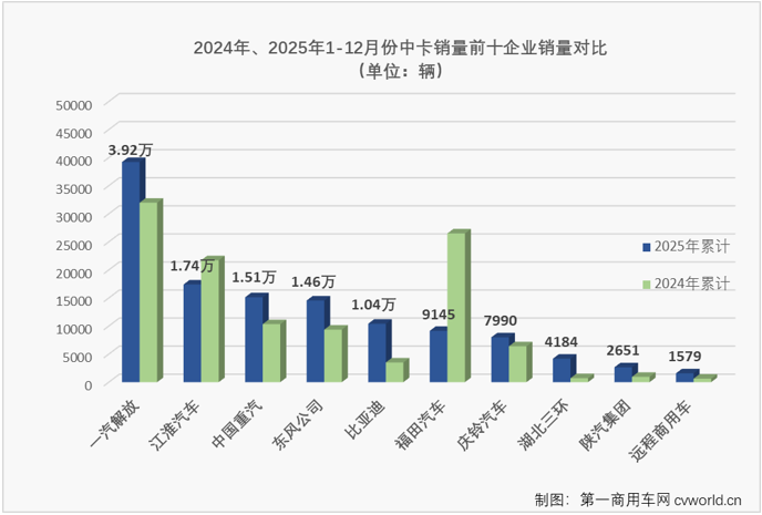 12月中卡销1.34万辆增15%,比亚迪摘冠,解放/东风拼前二,谁暴涨16倍进前四?