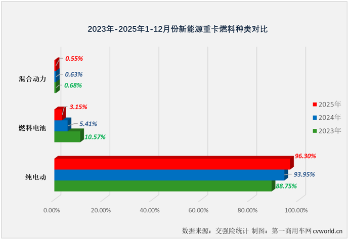 【第一商用车网 原创】2025年12月份,燃料电池重卡和混合动力重卡同比分别增长623%和209%,双双跑赢新能源重卡市场“大盘”,算是终于“爆发”了一次。