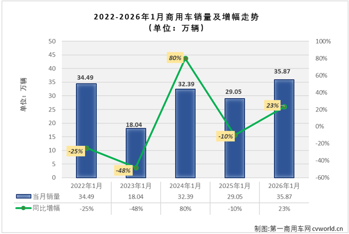 【第一商用车网 原创】2026年1月份,我国商用车市场销售35.87万辆,环比2025年12月份下降16%,同比增长23%,同比增速较上月(+15%)有所扩大,收获一波跨年“8连增”。