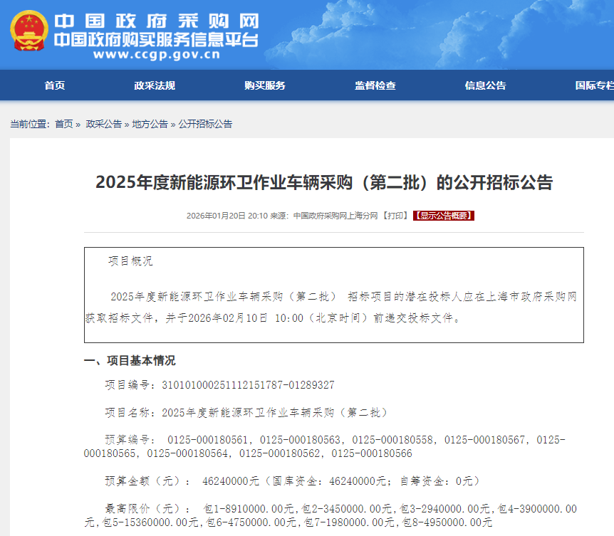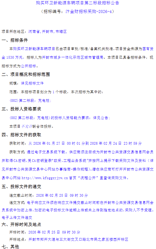 1月26日,河南开封购买环卫新能源车辆项目招标公告发布。预算金额1530万元,分两标段进行。第一标段预算1410万元,采购18吨纯电动厢式垃圾车14台、25吨纯电动多功能抑尘车3台及与之适配的相应配套设施;第二标段预算120万元,采购10台充电桩。