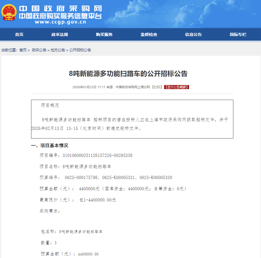 本项目环卫车辆为8吨新能源多功能扫路车,主要用于静安区道路清扫,详见采购需求。