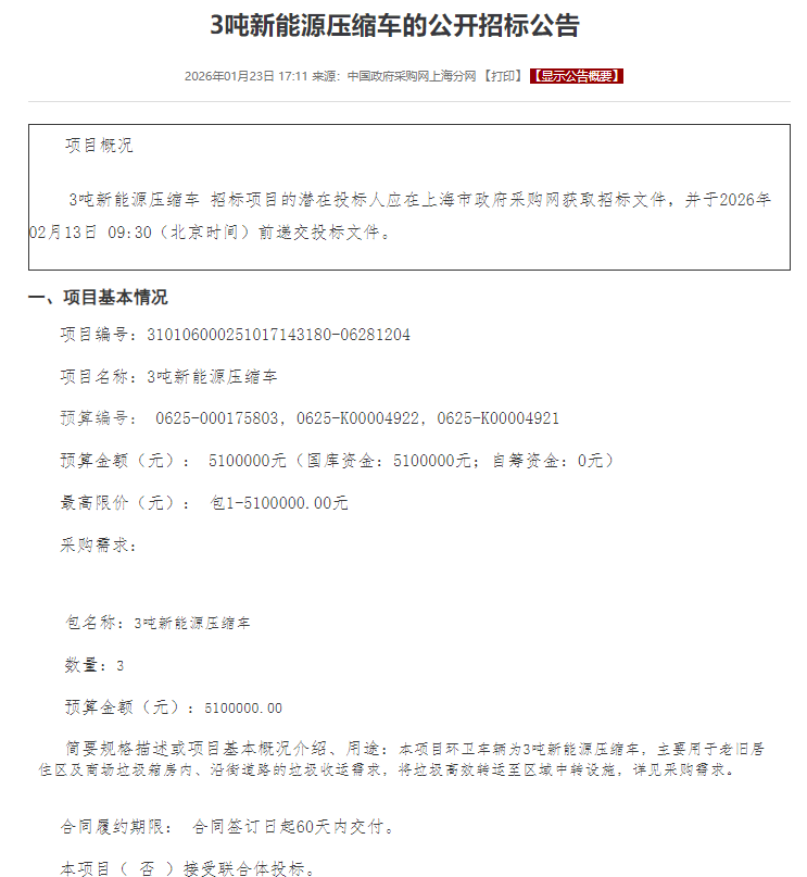 本项目环卫车辆为3吨新能源压缩车,主要用于老旧居住区及商场垃圾箱房内、沿街道路的垃圾收运需求,将垃圾高效转运至区域中转设施,详见采购需求。