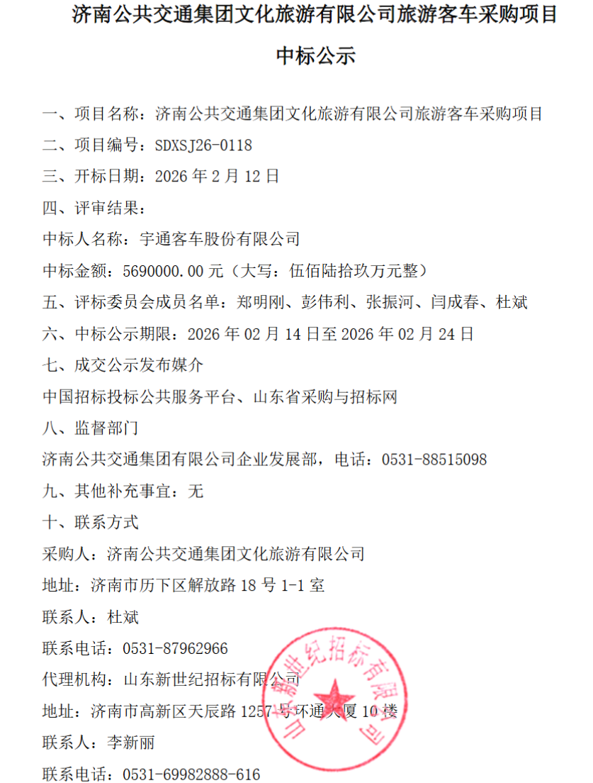 近日,济南公共交通集团文化旅游有限公司旅游客车采购项目(项目编号:SDXSJ26-0118)正式公示中标结果。宇通客车股份有限公司凭借569万元的报价成功中标,成为该项目的最终供应商。