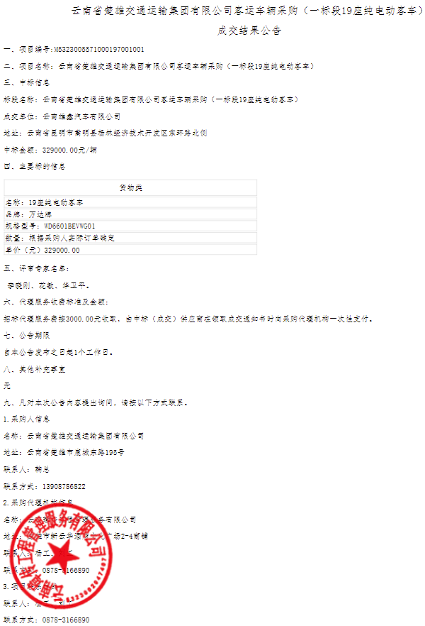 云南省楚雄交通运输集团有限公司客运车辆采购(一标段19座纯电动客车)成交结果公告