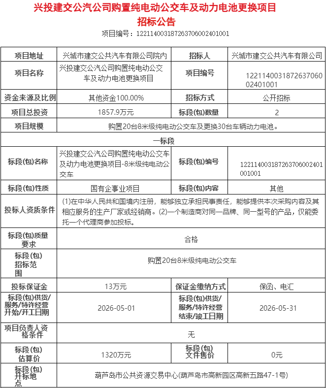 4月2日,兴投建交公汽公司购置纯电动公交车及动力电池更换项目-8米级纯电动公交车、动力电池更换招标公告发布。