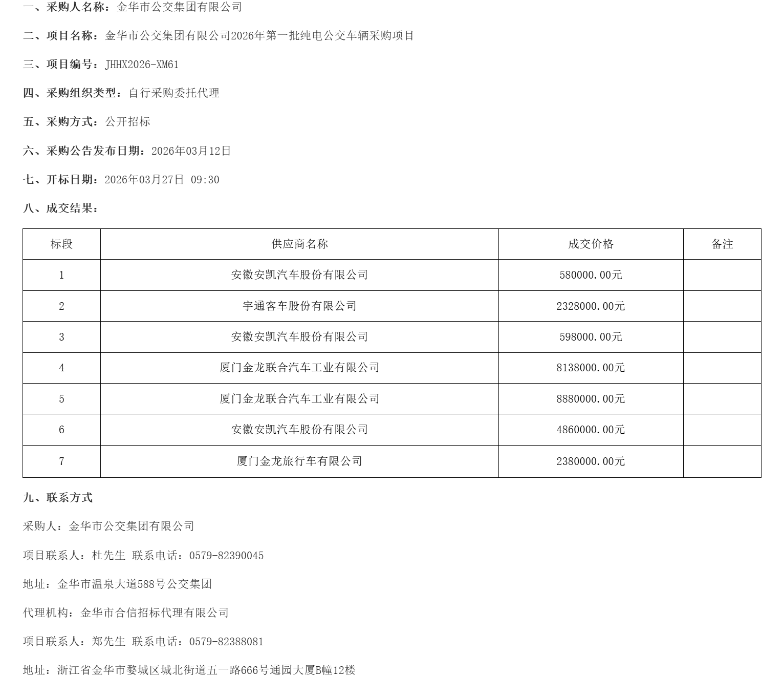 近日,金华市公交集团有限公司2026年第一批纯电公交车辆采购项目(非政府采购项目)中标结果正式公告。本项目共分为7个标段,安徽安凯汽车股份有限公司、宇通客车股份有限公司、厦门金龙联合汽车工业有限公司及厦门金龙旅行车有限公司成功中标。