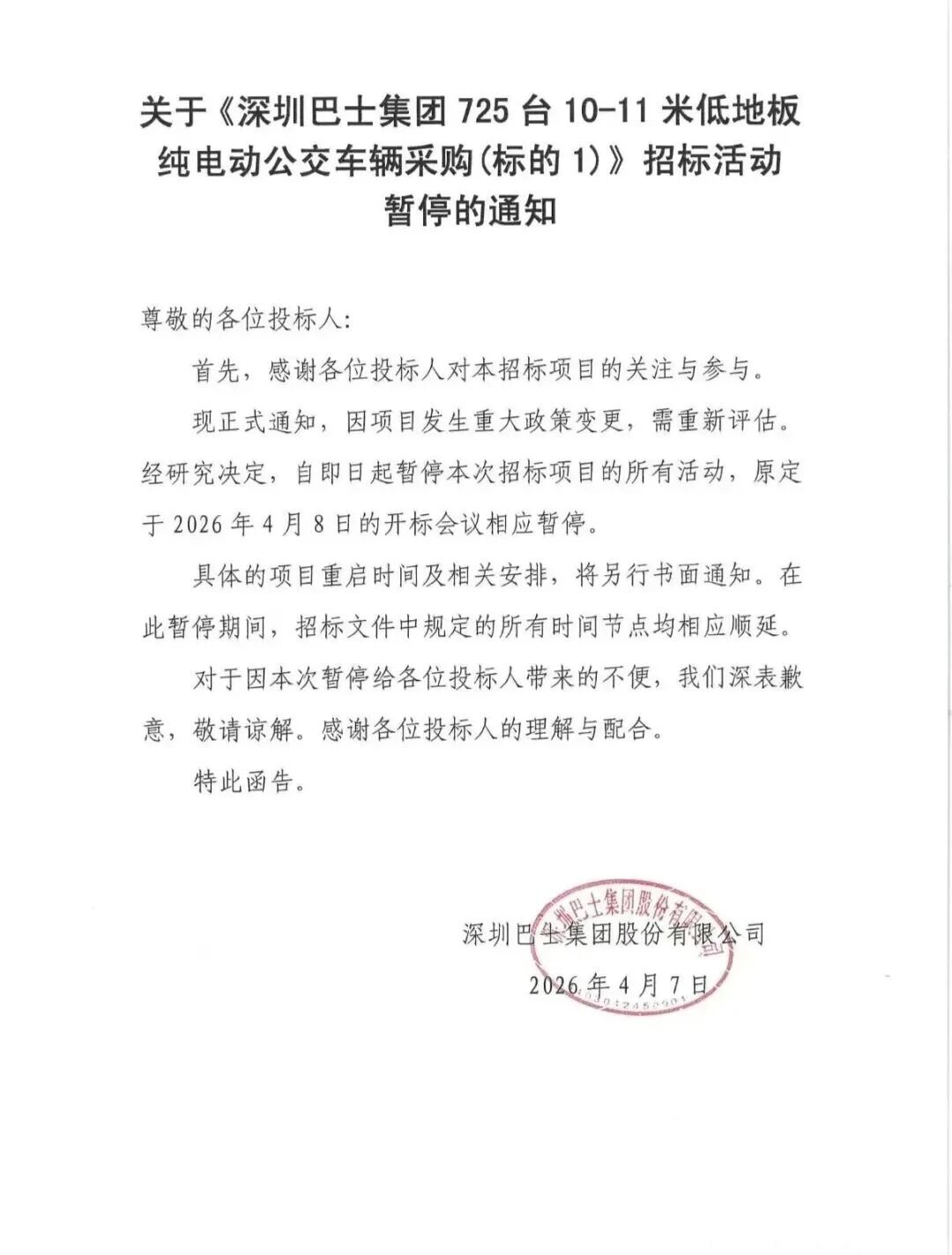 4月7日,深圳巴士集团发布公告称,受重大政策变更影响,原计划 4 月 8 日开标、预算超 6.8 亿元的 725 台 10-11 米低地板纯电动公交车采购项目正式暂停,具体重启时间将另行通知。