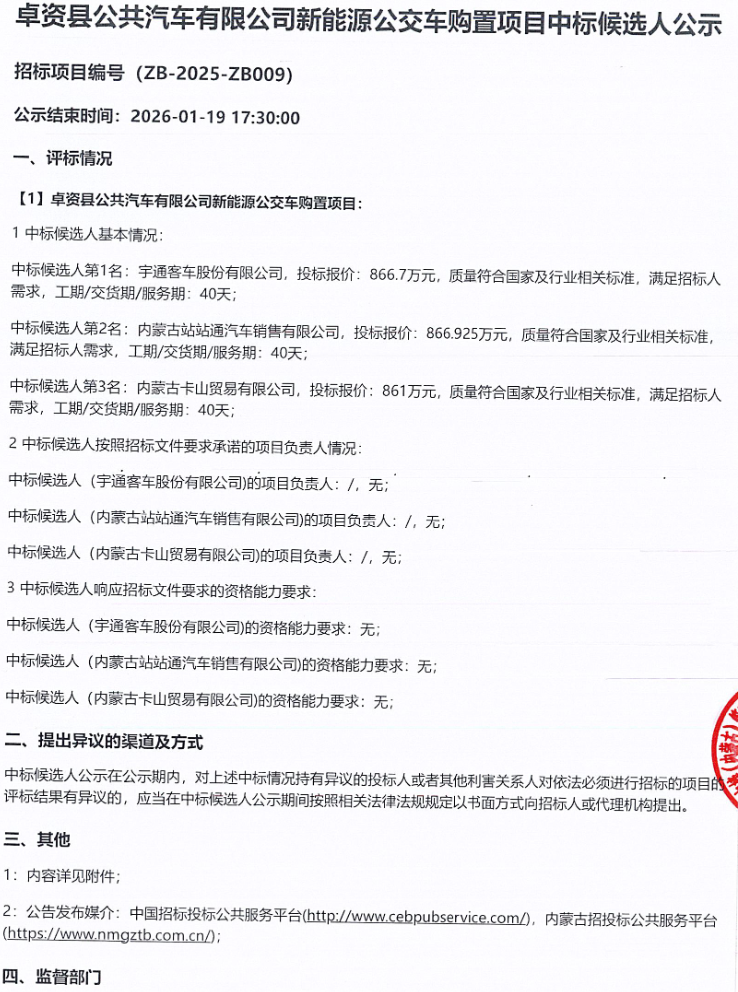 近日,卓资县公共汽车有限公司新能源公交车购置项目中标候选人公示发布。