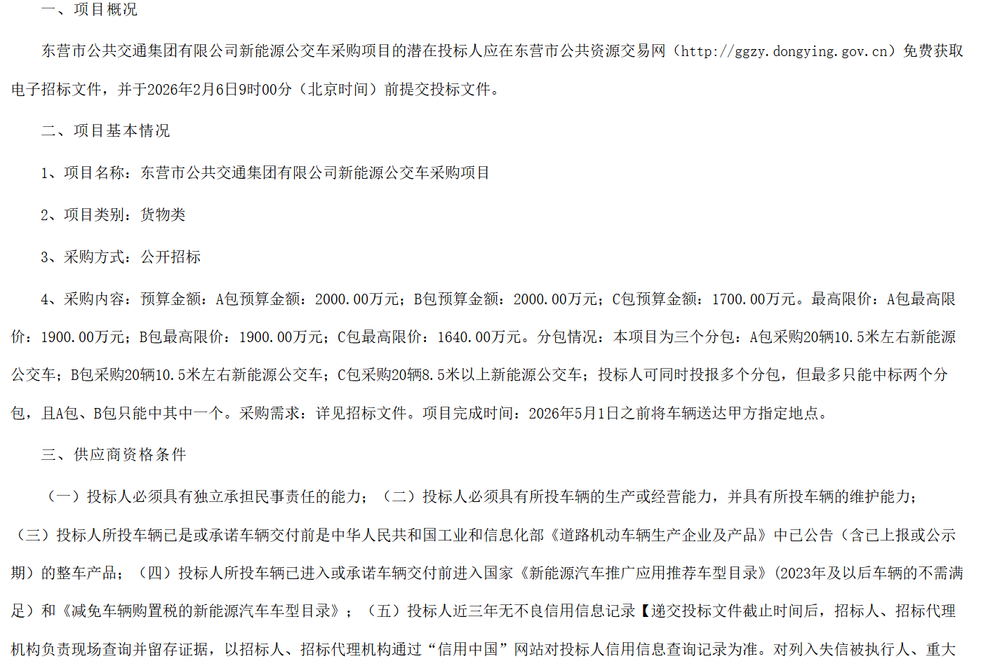近日,东营市发布新能源公交车采购项目,项目总预算达5700万元,共分为A、B、C三个分包,计划采购60辆新能源公交车。其中,A包和B包各采购20辆10.5米左右车型,预算金额均为2000.00万元,最高限价均为1900.00万元;C包采购20辆8.5米以上车型,预算金额1700.00万元,最高限价1640.00万元。投标人可同时投报多个分包,但最多只...