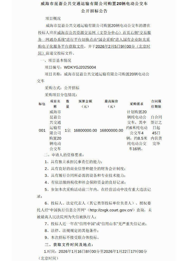 威海市昆嵛公共交通运输有限公司购置20辆电动公交车招标公告