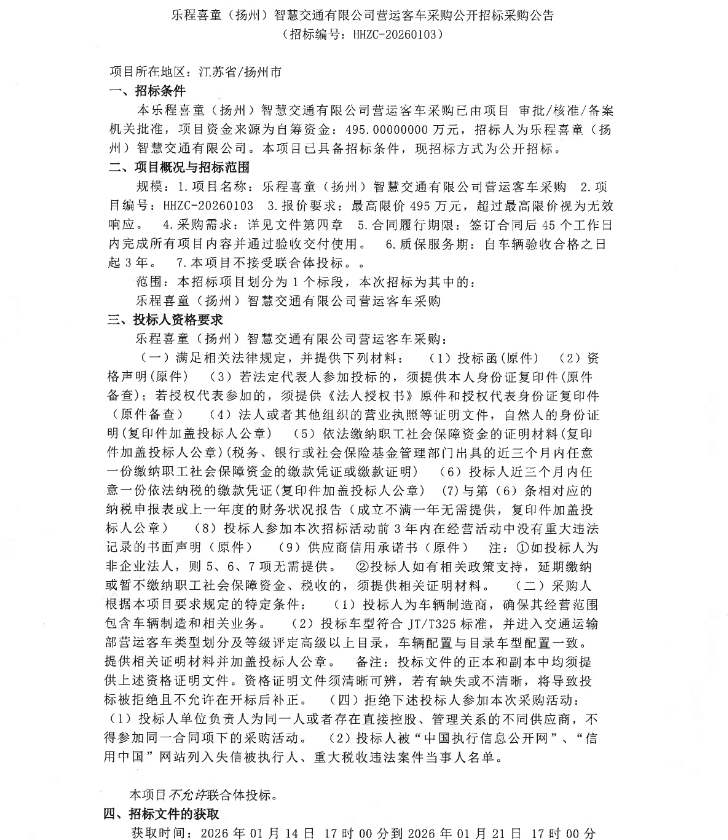 乐程喜童(扬州)智慧交通有限公司营运客车采购公开招标采购公告
