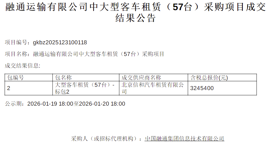 1月20日,融通运输有限公司中大型客车租赁(57台)采购项目成交结果公告发布。公告显示,成交供应商为北京信和汽车租赁有限公司,含税总报价为3245400元。
