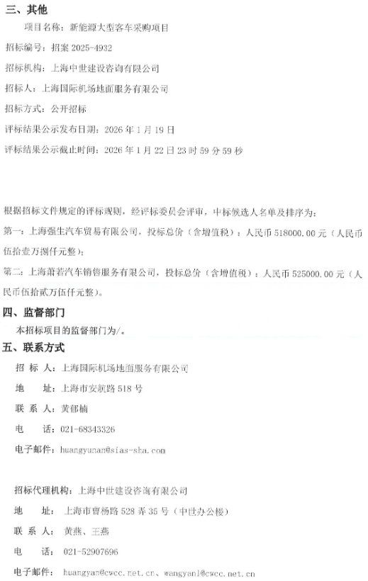 1月19日,上海国际机场地面服务有限公司新能源大型客车采购项目的评标结果公示发布。中标候选人第一名为上海强生汽车贸易有限公司,投标报价为51.8万元。