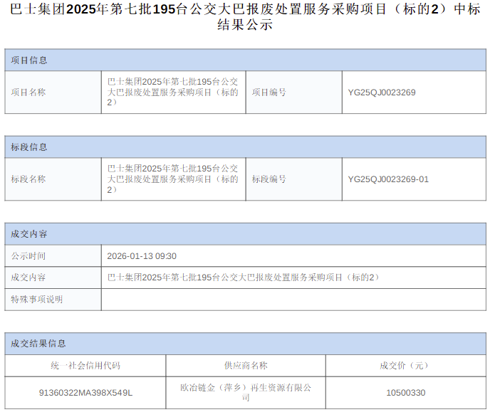 1月13日,巴士集团2025年第七批195台公交大巴报废处置服务采购项目(标的2)中标结果公示发布。