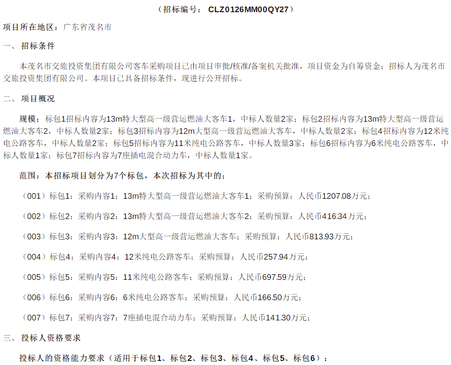 4月16日,茂名市交旅投资集团有限公司客车采购项目招标公告发布。