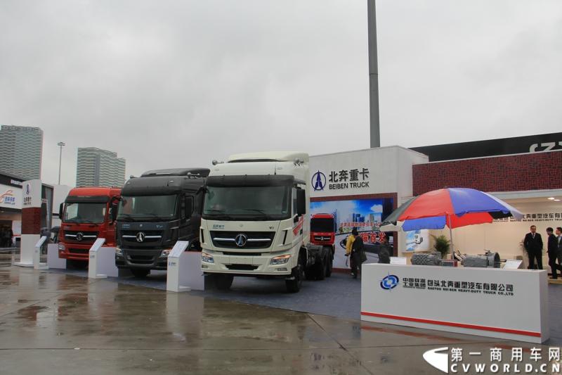 本次上海车展,北奔重汽公司携三款产品参展,其中高端物流车V3HT和窄车身轻量化车V3M两款车都是首次面市。图为2013年上海车展北奔重汽展台。