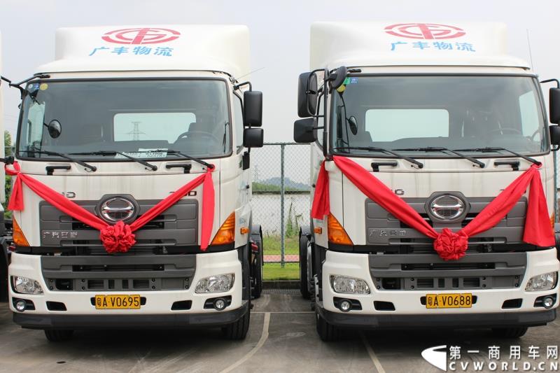 9月10上午,广汽日野&广汽丰田物流有限公司交车仪式在广州市广汽丰田物流园区举行,在本次交车仪式中,共有23辆广汽日野700国IV排放4х2牵引车现场交付。图为:崭新的广汽日野车