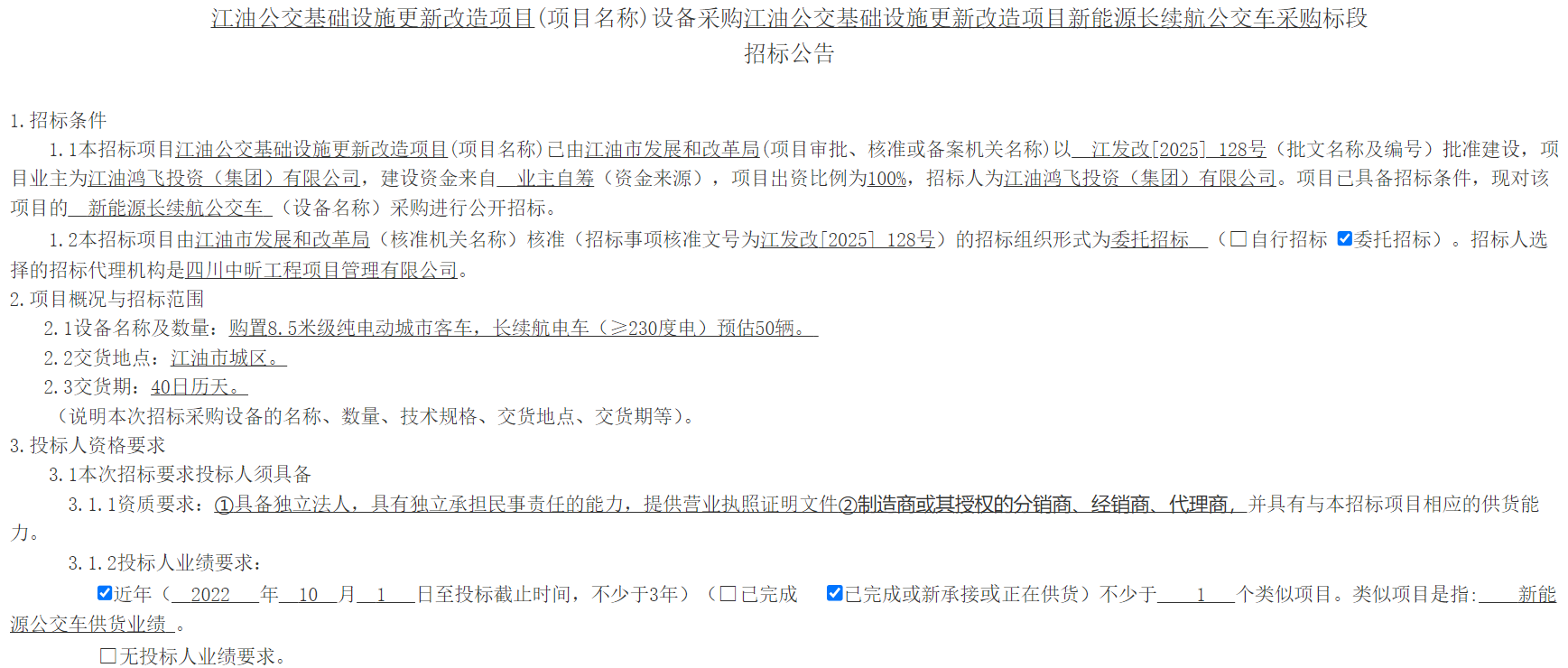 9月30日,江油公交基础设施更新改造项目新能源长续航公交车采购标段招标公告发布在四川省公共资源交易信息网发布。本项目购置8.5米级纯电动城市客车,长续航电车(≥230度电)预估50辆。