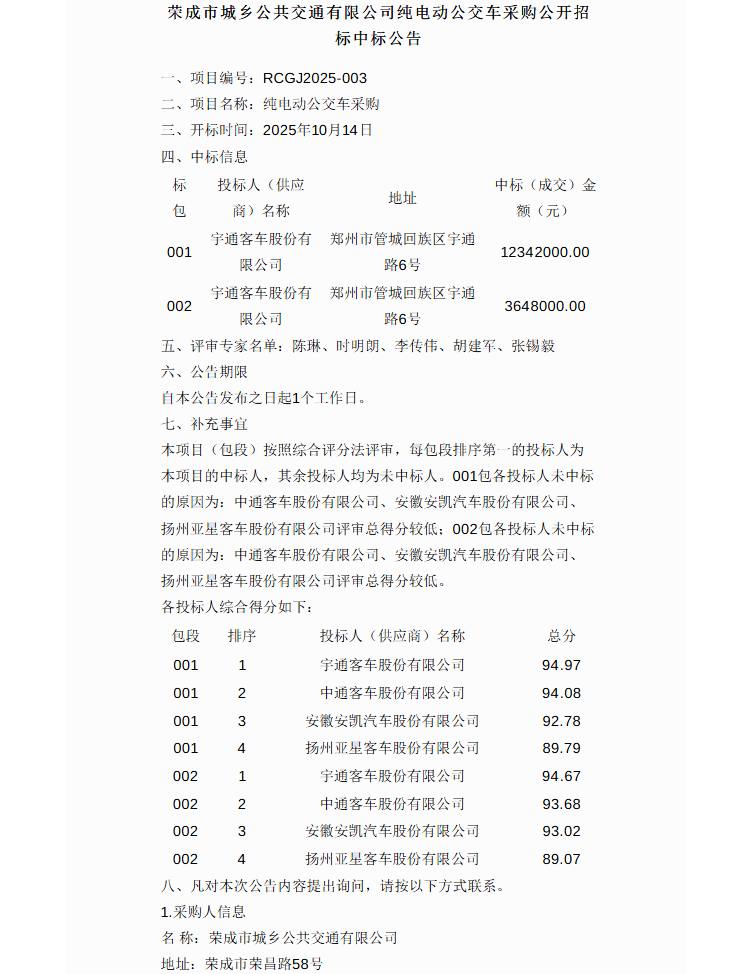 10月15日,荣成市城乡公共交通有限公司发布纯电动公交车采购公开招标中标结果公告,宇通连中两包。