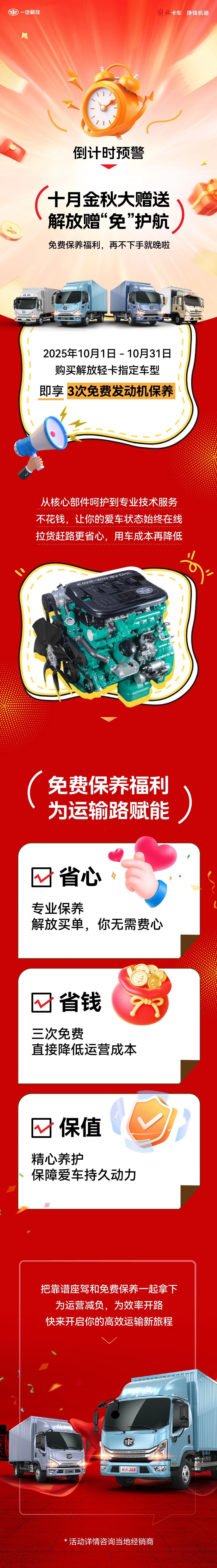 2025年10月1日-10月31日购买解放轻卡指定车型即享3次免费发动机保养。