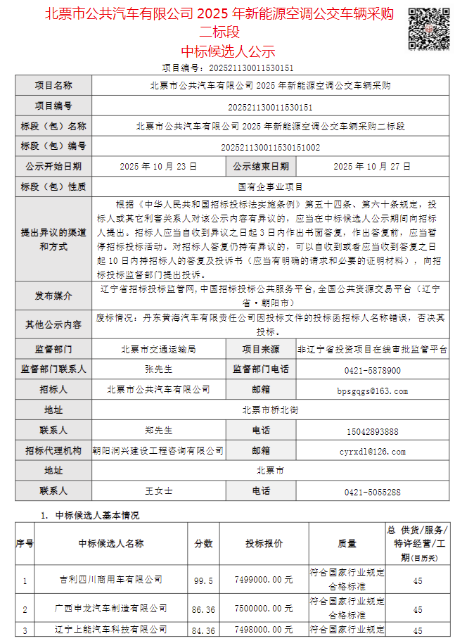 10月23日,北票市公共汽车有限公司2025年新能源空调公交车辆采购二标段发布。公告显示,一标段中标候选人第一名为吉利四川商用车有限公司,投标报价为749.9万元。