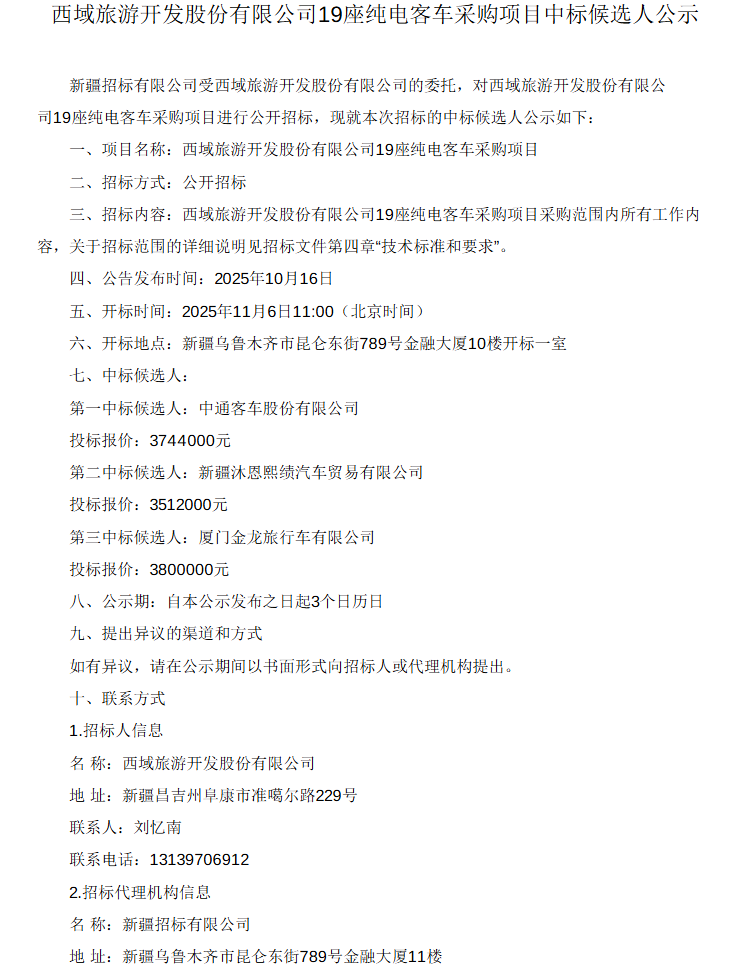 近日,西域旅游开发股份有限公司同步发布38座、23座、19座纯电客车采购项目的中标候选人公示。其中,23 座和 19 座纯电客车采购项目的第一中标候选人均为中通客车股份有限公司,38 座纯电客车采购项目的第一中标候选人为宇通客车股份有限公司。