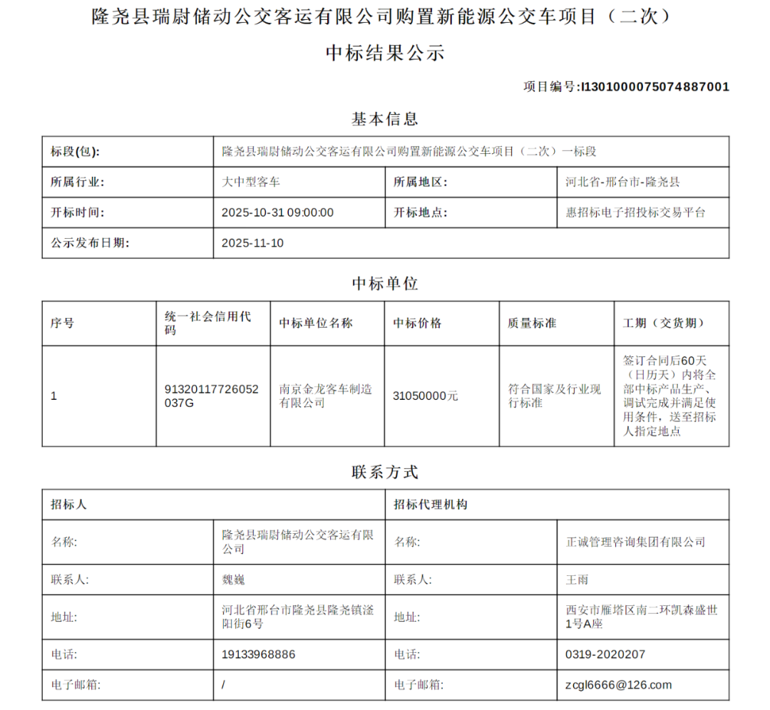 日前,河北省邢台市隆尧县瑞尉储动公交客运有限公司购置新能源公交车项目(二次)中标公告发布。根据此前招标公告显示,该项目共分为两个标段,一标段为50辆(16+1座),二标段为50辆(24+1座),共购置100辆新能源公交车。