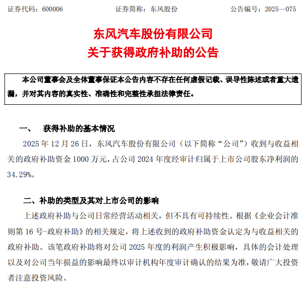 12月30日,东风汽车股份有限公司发布关于获得政府补助的公告。2025年12月26日,东风汽车股份有限公司收到与收益相关的政府补助资金1000万元,占公司2024年度经审计归属于上市公司股东净利润的34.29%。