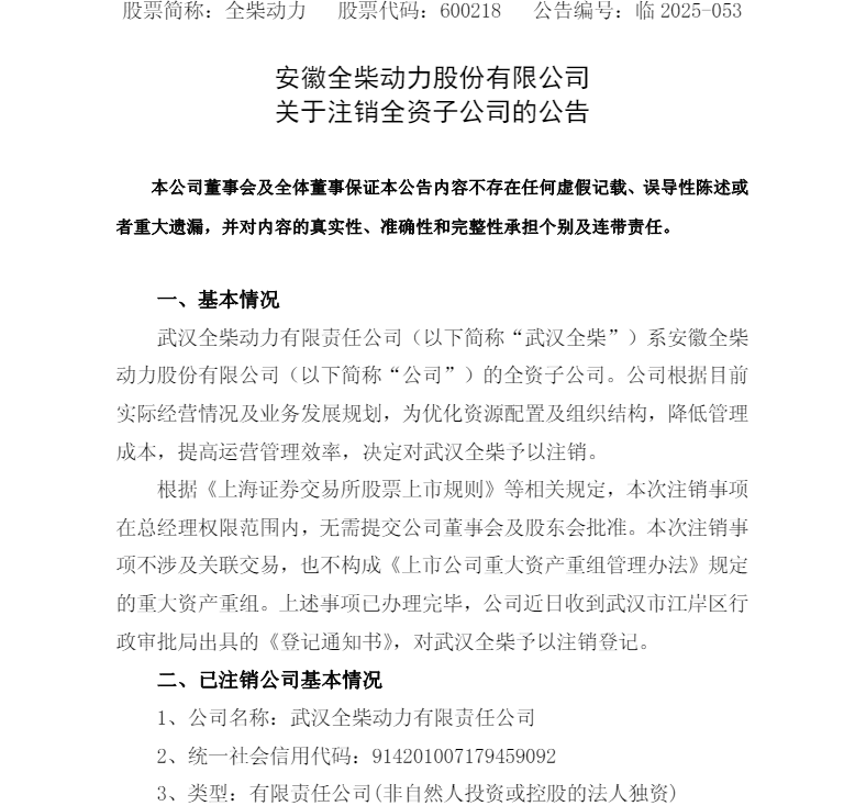 近日,安徽全柴动力股份有限公司发布关于注销全资子公司的公告,公告显示,安徽全柴动力股份有限公司(以下简称“公司”)决定注销全资子公司武汉全柴动力有限责任公司(以下简称“武汉全柴”)。
