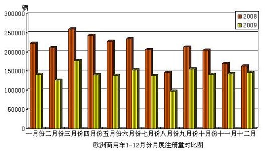 12月份,欧洲商用车注册量为146516辆,比去年同期下降了10.6%。2009年1-12月,欧洲商用车累计注册量为1706996辆,与去年同期相比下降了32.4%。