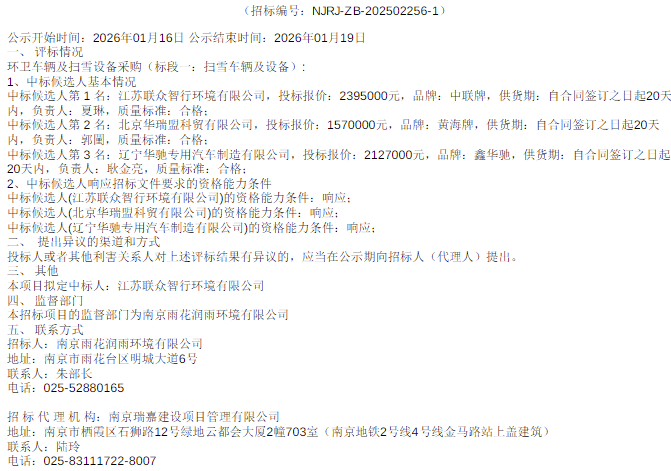1月16日,环卫车辆及扫雪设备采购(标段一:扫雪车辆及设备)中标候选人公示发布。