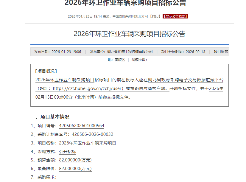 宜昌市2026年环卫作业车辆采购项目招标公告