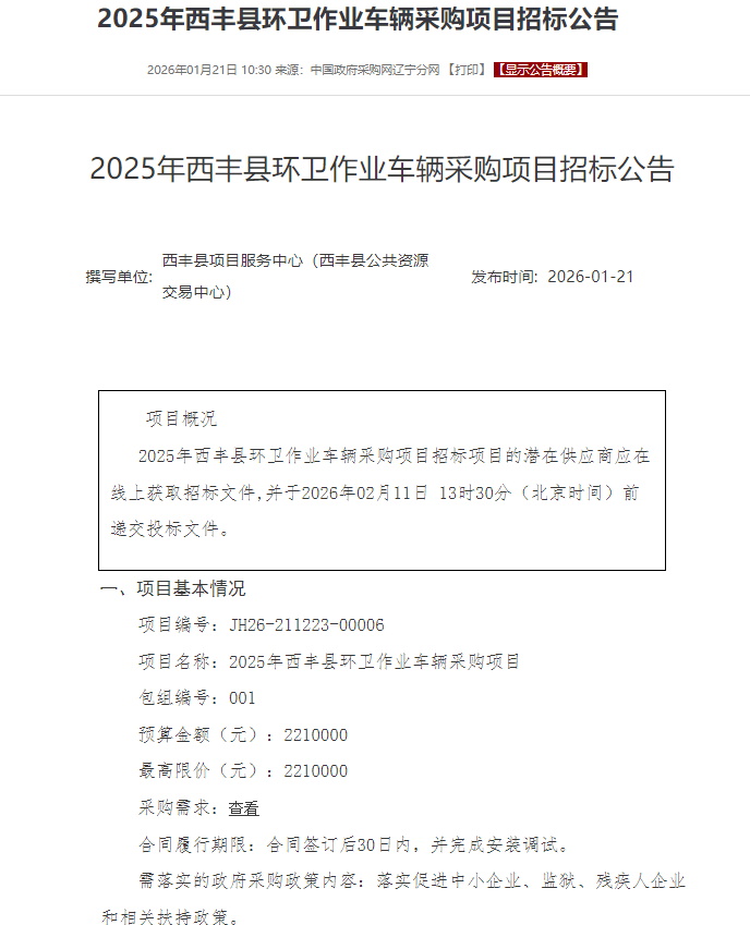 西丰县221万元环卫作业车辆采购项目